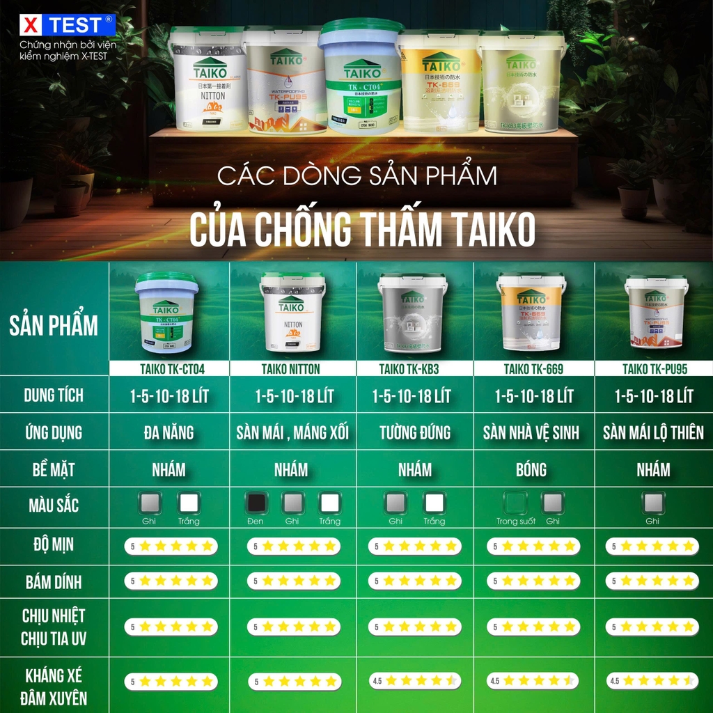 | TAIKO NITTON | Lon 1kg – Thùng 18kg | 2.400.000 – 2.500.000 | Mái lộ thiên, sàn chưa lát gạch |