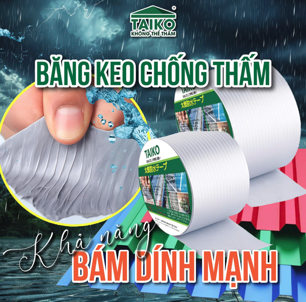 Băng keo chống thấm TAIKO là sản phẩm dán chống thấm đa năng, ứng dụng công nghệ màng nhôm cách nhiệt cao cấp, kết hợp lớp keo siêu dính đặc biệt giúp ngăn nước xâm nhập ngay lập tức. Sản phẩm phù hợp để dán kín, chống dột, trám nứt trên mọi bề mặt như mái tôn, tường, bê tông, nhựa, ống nước, mái hiên, ban công,…