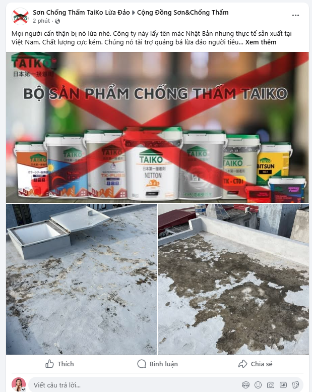 Gần đây, chúng tôi phát hiện các fanpage giả mạo mang tên “Sơn Chống Thấm Taiko Lừa Đảo” và “Sơn Taiko Japan Lừa Đảo”. Các trang này liên tục đăng tải thông tin tiêu cực, bịa đặt, hoàn toàn không có căn cứ, nhằm gây hoang mang dư luận và ảnh hưởng nghiêm trọng đến uy tín thương hiệu TAIKO.