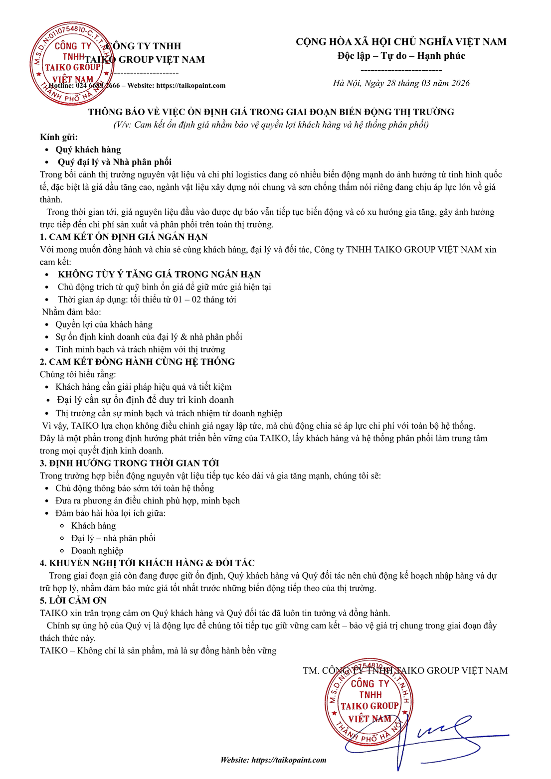 🔴 2. CAM KẾT ỔN ĐỊNH GIÁ TỪ TAIKO