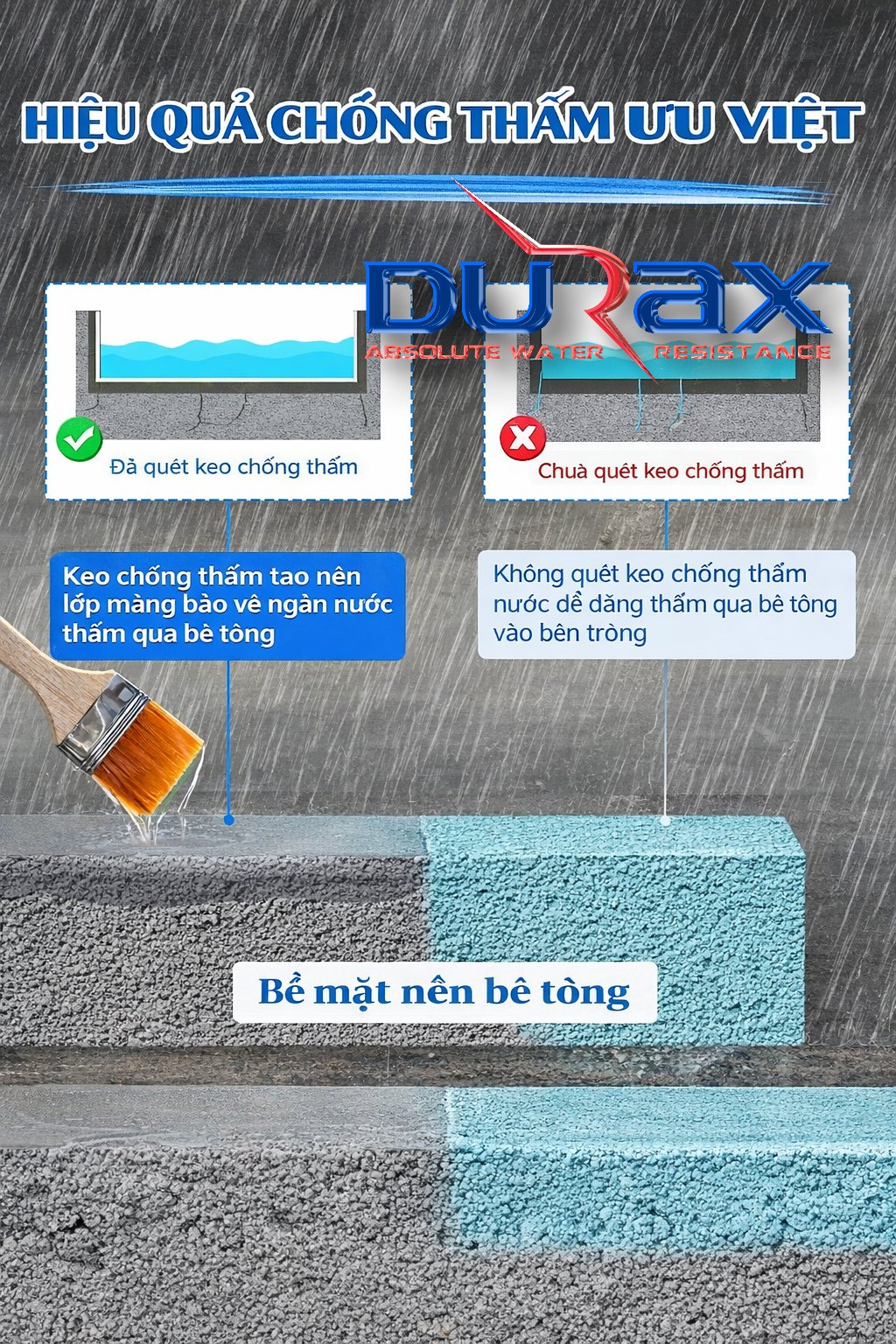 👉 Vai trò của DURAX D5 là chống thấm bề mặt diện rộng, còn: