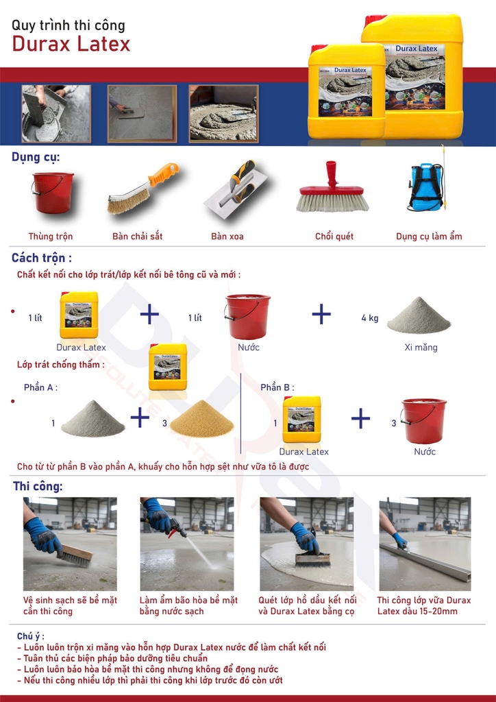 DURAX LATEX là nhũ tương polymer Styrene Acrylic gốc nước, dạng sữa trắng đục, mịn và có độ kết dính cực cao. Nhờ khả năng tương thích hoàn hảo với xi măng, sản phẩm giúp cải thiện độ bền, tăng đàn hồi và chống thấm rất tốt.