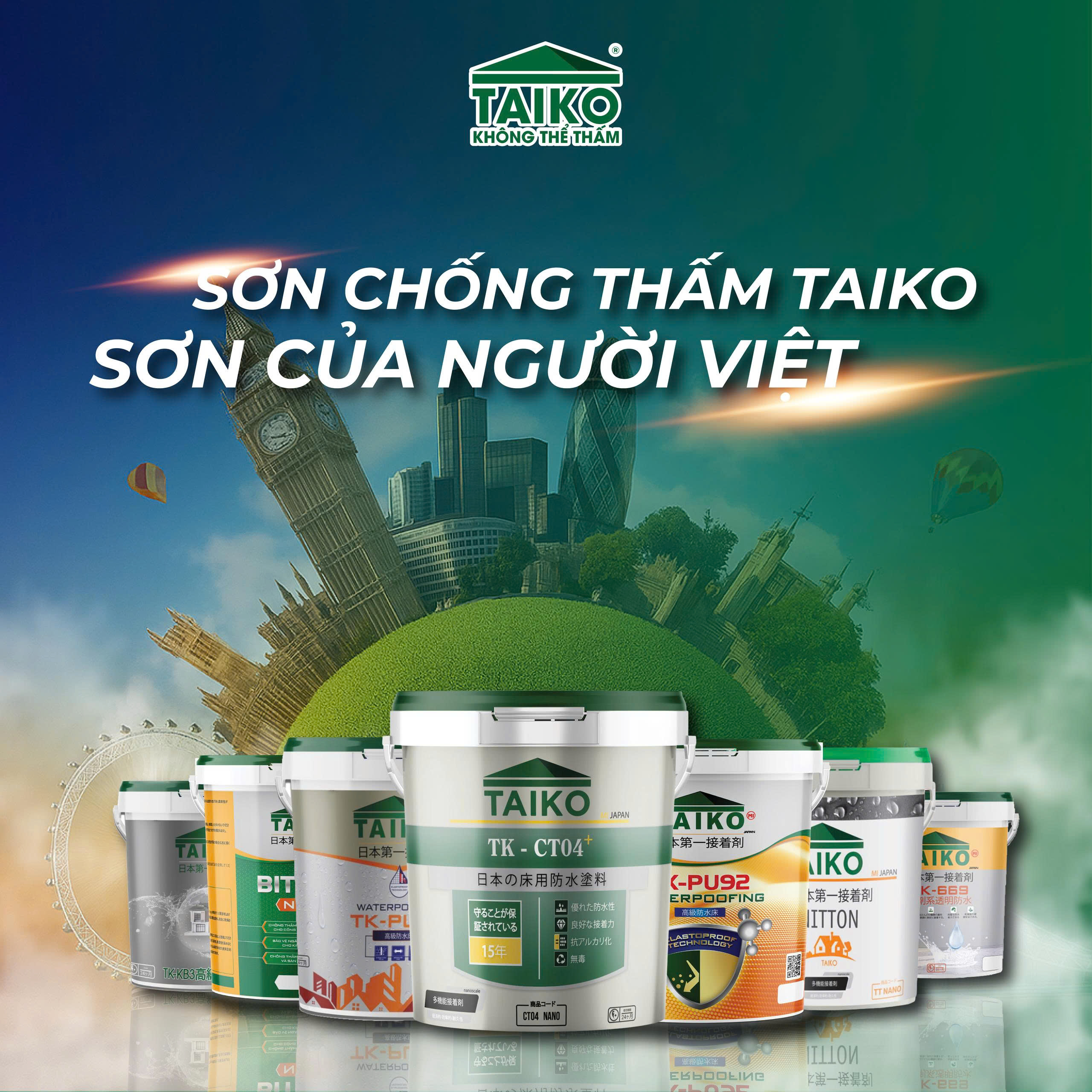 Màng màng lỏng gốc nước / PU đàn hồi cao: Ví dụ sản phẩm “TAIKO PU95” được giới thiệu tại thị trường Việt Nam cho sân thượng, lớp phủ bảo vệ, khả năng chống thấm & cách nhiệt.