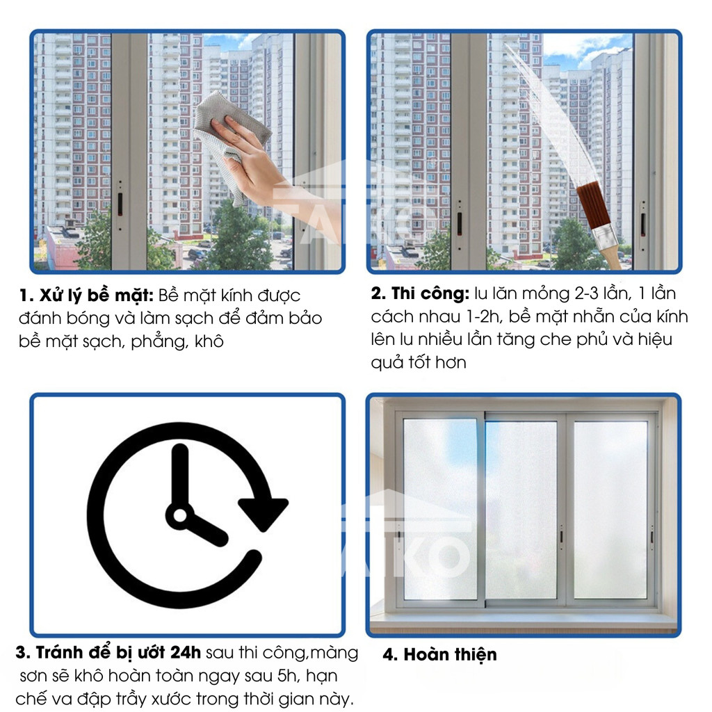 Sản phẩm được nghiên cứu và sản xuất bởi TAIKO Group Việt Nam, áp dụng công nghệ Acrylic Nano – Silicone monomer tiên tiến từ Nhật Bản. Với lớp phủ mờ tự nhiên, màng sơn tạo hiệu ứng như kính mờ phun cát, giúp che chắn tầm nhìn nhưng vẫn cho ánh sáng xuyên qua nhẹ nhàng.