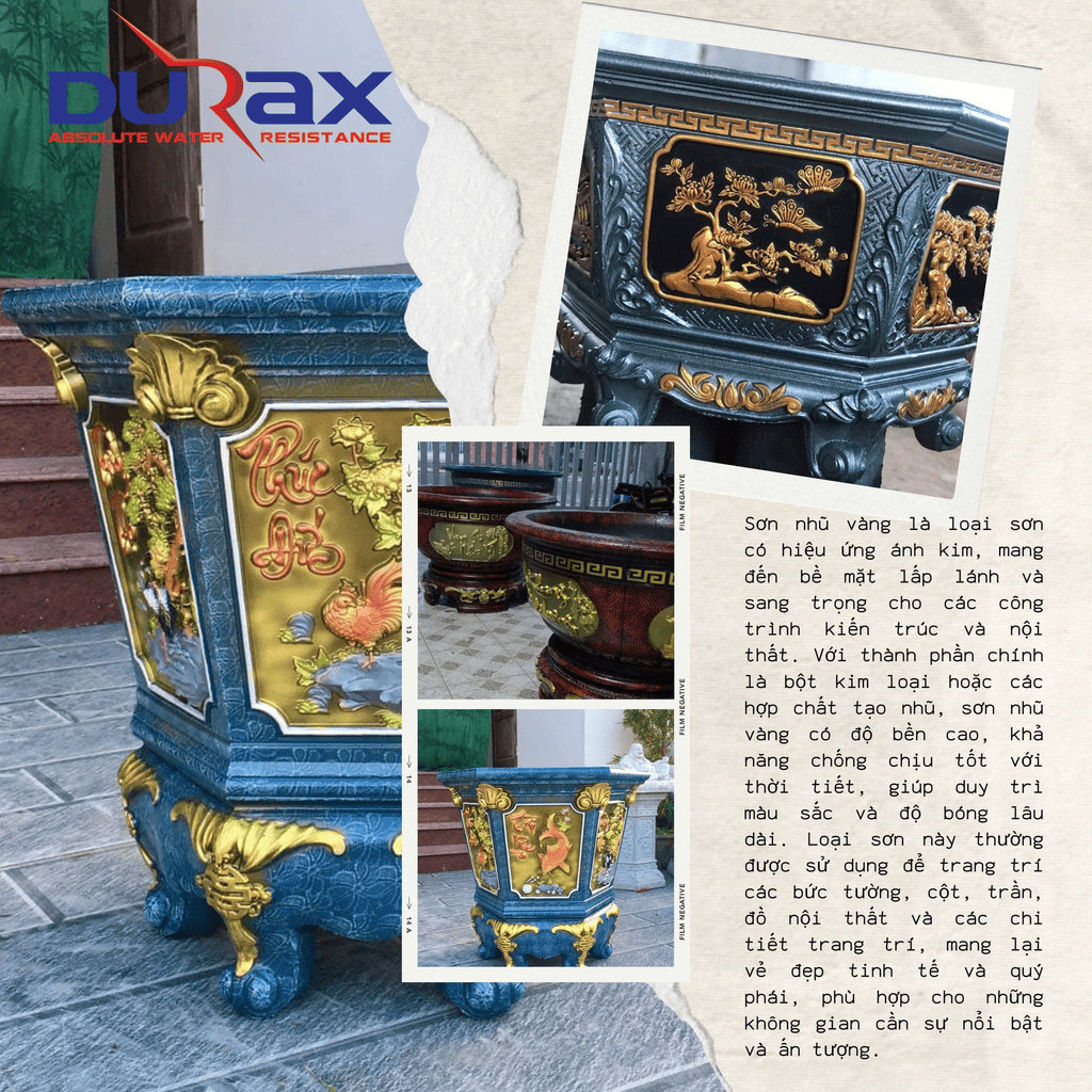 → Là sơn nhũ ánh kim thật, sử dụng bột kim loại nhũ ánh vàng, bạc, đồng – tạo hiệu ứng lấp lánh dưới ánh sáng.