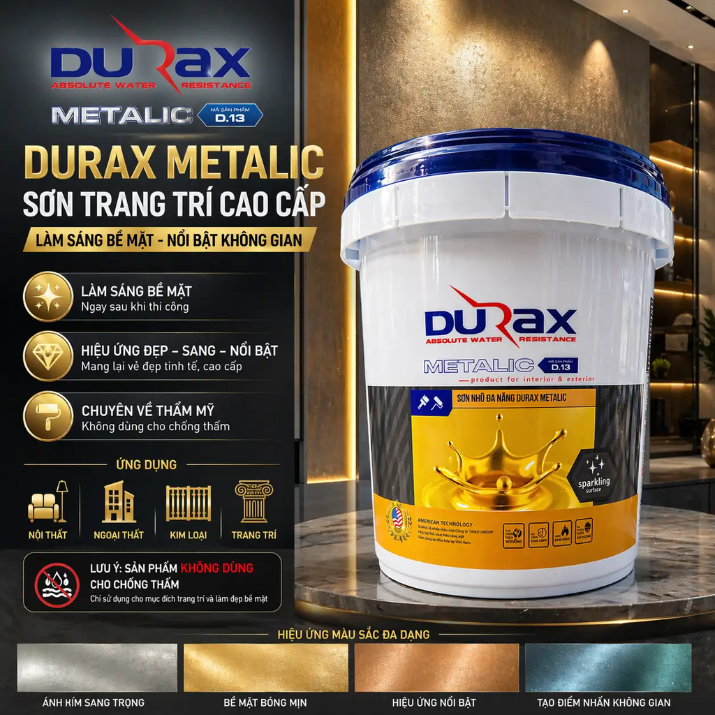 DURA METALLIC là dòng sơn nhũ ánh kim cao cấp, tạo hiệu ứng ánh kim lấp lánh sang trọng, chuyên dùng trang trí nội – ngoại thất, đồ mỹ thuật, decor cổ điển – hiện đại. Sản phẩm có 3 màu sắc: Nhũ Vàng, Nhũ Bạc và Nhũ Đồng.