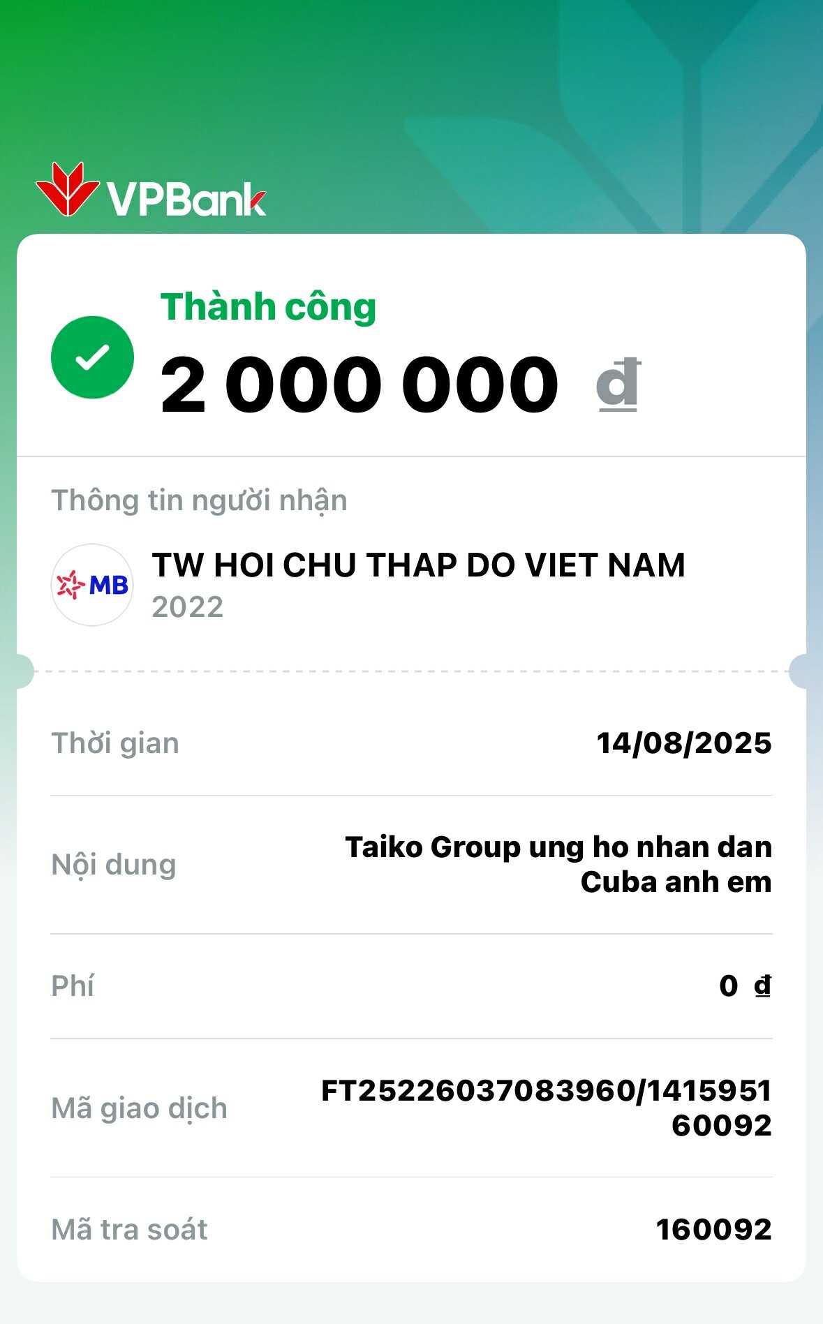 Hôm nay, TAIKO GROUP tự hào thông báo về việc gửi tặng 2.000.000 đồng để hỗ trợ nhân dân Cuba, như một lời tri ân chân thành đến tình cảm và sự giúp đỡ mà nhân dân Cuba đã dành cho Việt Nam trong những năm tháng khó khăn nhất. Đây không chỉ là một hành động sẻ chia, mà còn là minh chứng cho mối quan hệ đoàn kết, thủy chung giữa hai quốc gia Việt Nam và Cuba.