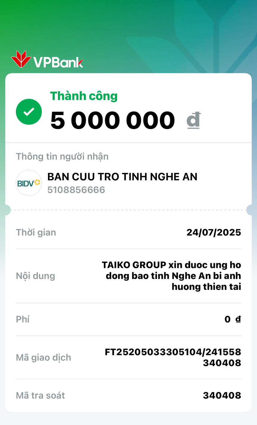 - Tại Nghệ An (2025): TAIKO GROUP ủng hộ 5 triệu đồng thông qua Ủy ban Mặt trận Tổ quốc Việt Nam tỉnh Nghệ An, nhằm hỗ trợ bà con khắc phục hậu quả bão lũ, tái thiết cuộc sống.