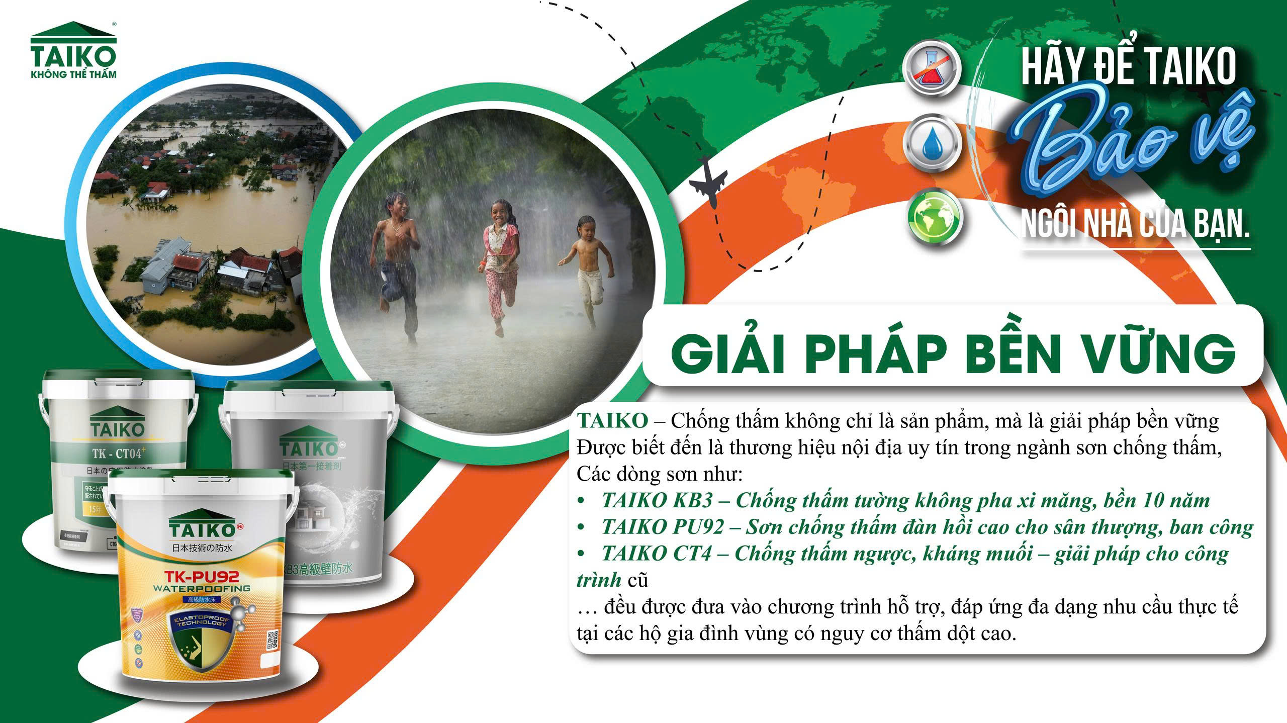 Tài trợ vật tư chống thấm: Gồm sơn chống thấm tường, mái, sàn… sử dụng các sản phẩm như TAIKO KB3, PU92, CT4 – nổi bật với độ bền cao, chống thấm ngược, đàn hồi tốt và dễ thi công.