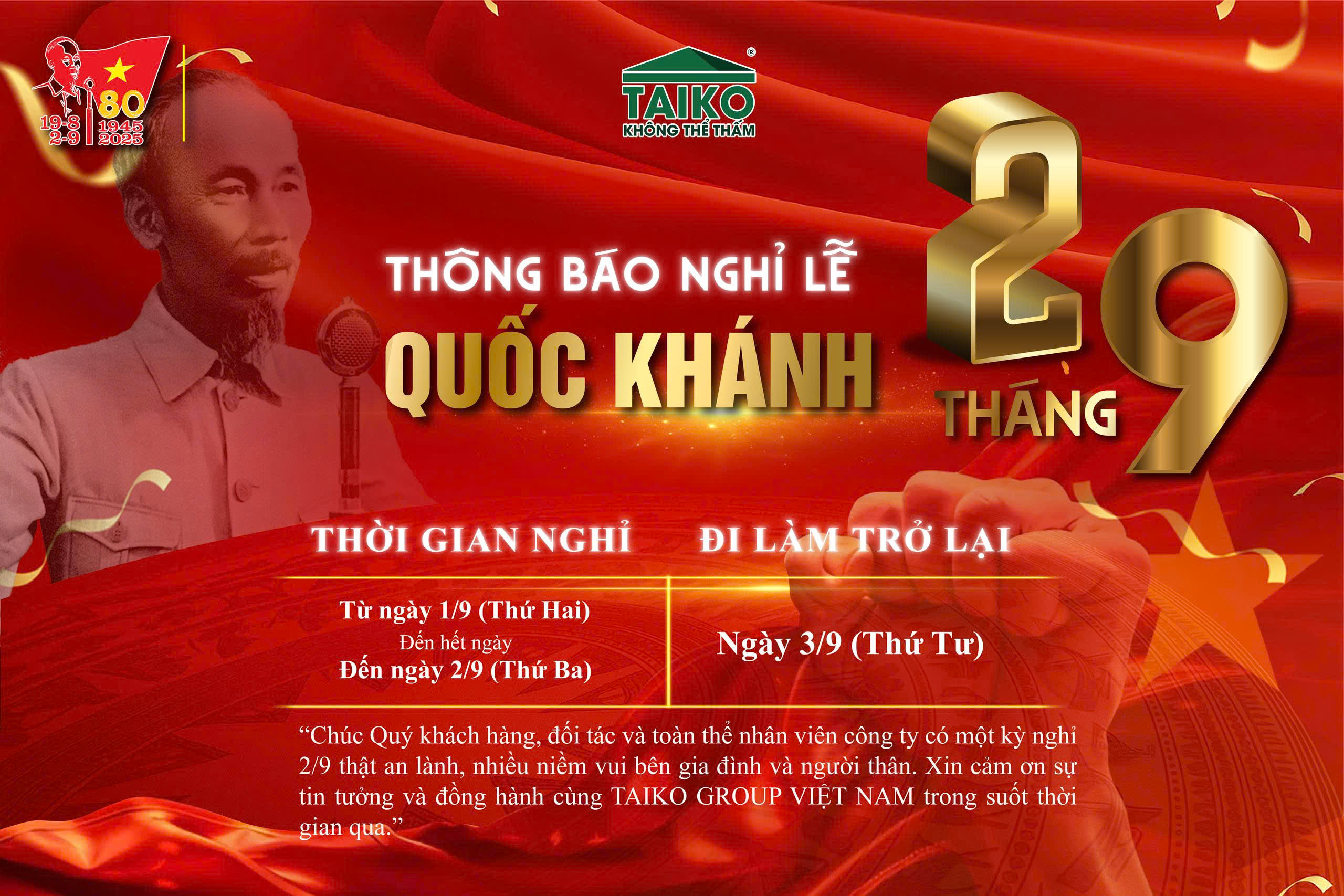 Hòa chung không khí hào hùng của cả nước, TAIKO GROUP xin gửi đến Quý khách hàng, Quý đối tác và toàn thể cán bộ nhân viên lịch nghỉ lễ Quốc khánh 2/9 năm 2025 như sau: