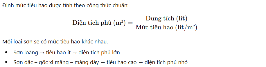 Thì định mức sơn giữa các loại khác nhau rất lớn. Có loại chỉ phủ được 6–7 m² cho 5 lít, nhưng có loại lên tới 25–30 m².